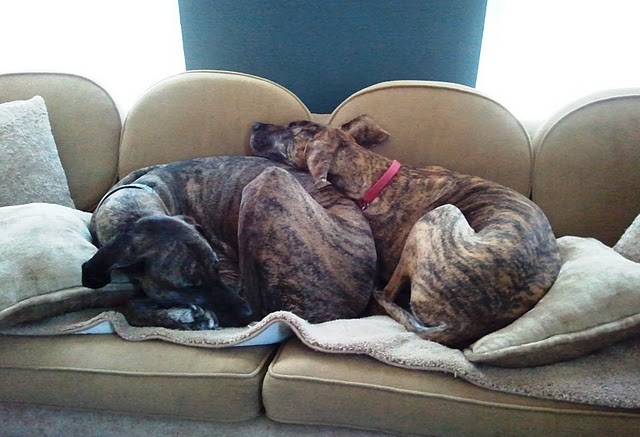 At around 11:30, we went with the Curvins to brunch and then dropped them at the airport. When we got home, we saw this brindle dog stand up on the sofa, stretch, and step down. We assumed it was Huff, but it was Minnie who we’d left in her crate! We quickly looked around for signs of mayhem, but all was quite well. She had found a way out and was napping on the sofa while the other two were following suit upstairs, unfazed. Still, we’re going to batten down the hatches for our first day back at work tomorrow so that our pet sitters don’t find her on the lamb again.