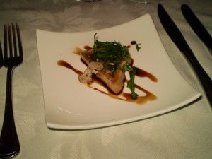 1) The first course for all of us was this diminutive but flavorful triangular slice of winter squash and wild mushroom terrine.