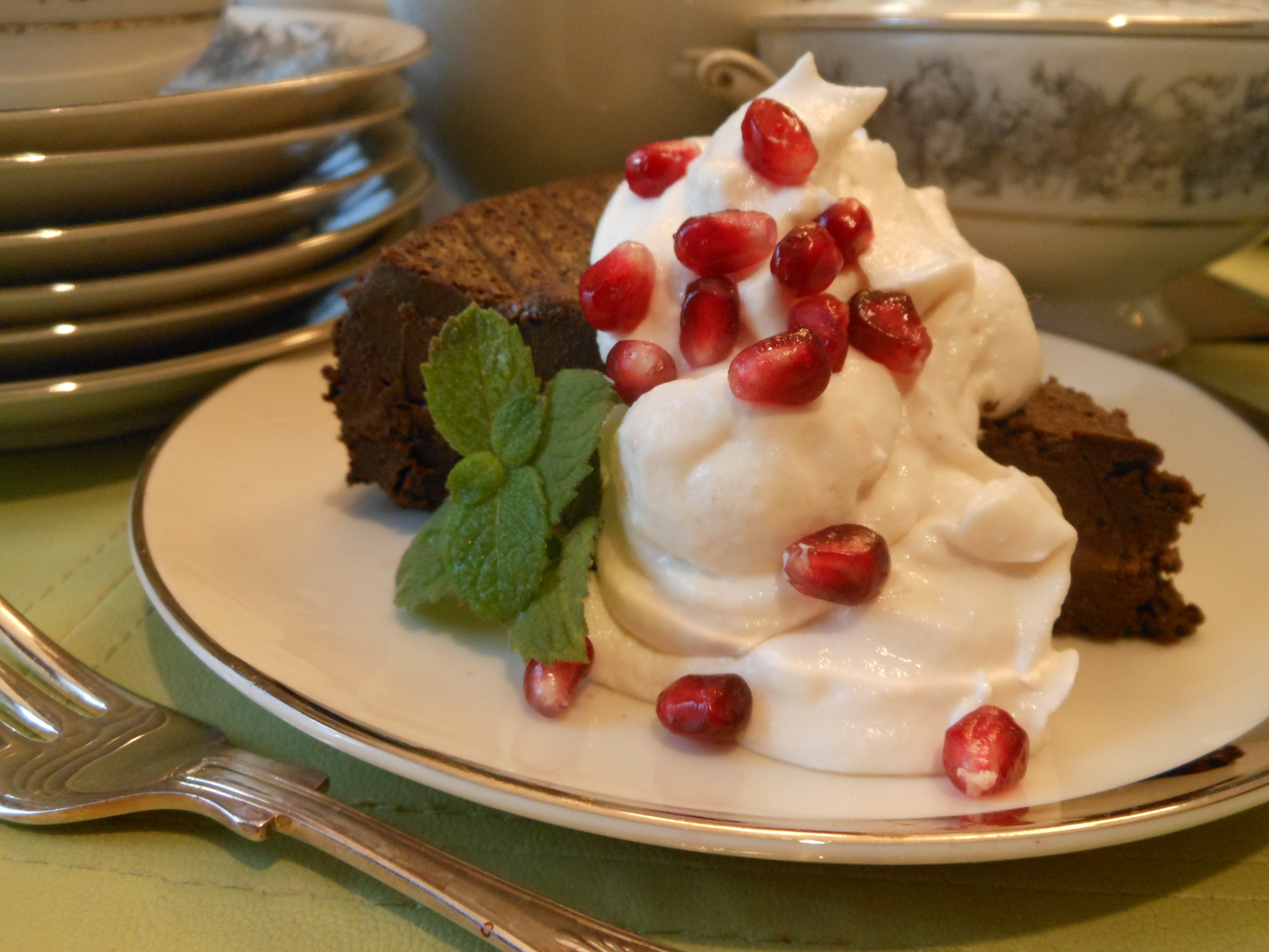 I’m posting this recipe now just in case you, like me, are offering chocolate for the first time for Thanksgiving. But, personally, I think the winter holidays are the dessert’s time to shine, dressed up with a little pomegranate seed bling, as in the photo, or a bit of crushed peppermint. In the summer, it has to be raspberries.