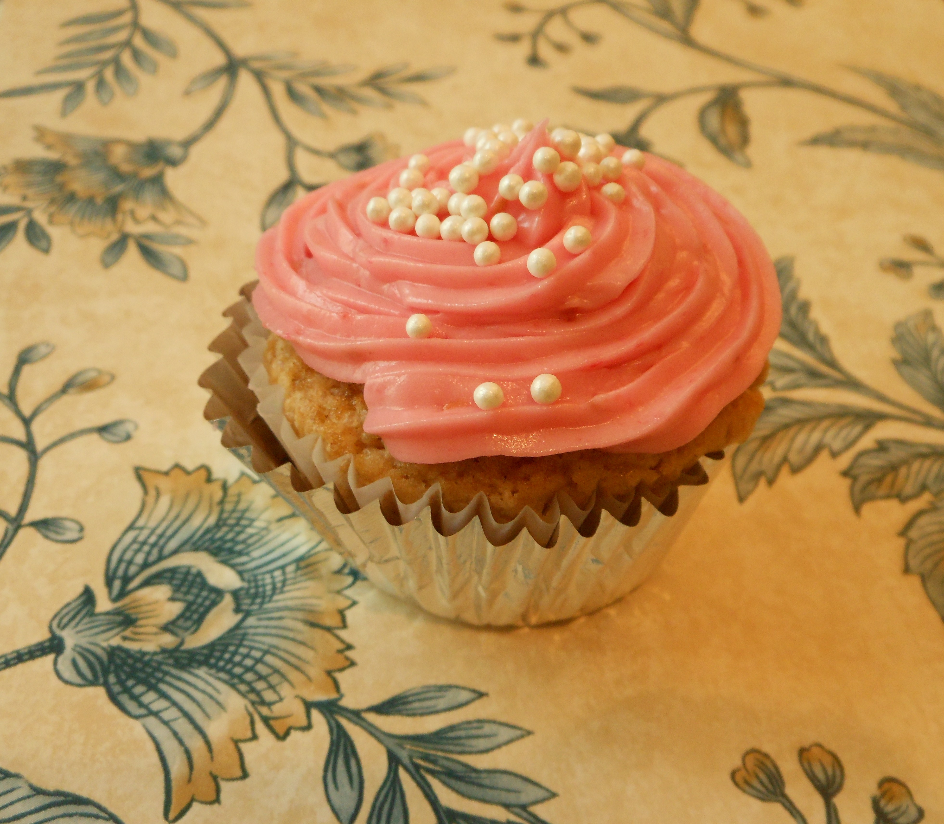 The day before you plan to make the frosting, marinate the berries: in a small bowl, dissolve sugar in the sparkling wine, add berries, stir well, cover, and refrigerate for 24 hours. To make frosting, cream butter, shortening, and cream cheese with an electric mixer until fluffy. Add the powdered sugar, a cup at a time, starting the mixer on slow and gradually increasing the speed so that you don’t coat yourself in sugar. After you’ve added about 2 cups of the sugar, drain berries and add all of them with another cup of sugar, beating well. Don’t be alarmed if mixture looks curdled; it will smooth out as the remaining sugar is added. Continue beating and adding remaining sugar and vanilla until the frosting is thick and creamy. You may find that you need more or less of the sugar in the marinade, as well as in the frosting, depending on how sweet and moist the berries are, respectively. So adjust as you see fit. Use the frosting immediately or refrigerate until ready to use. I like to pipe swirls of frosting on top of the cupcakes using a pastry bag before garnishing with white nonpareil pearls for a very feminine look (I purchase the pearls at our local Kroger). However, a fresh raspberry perched on top , perhaps with a mint leaf, would also be lovely.