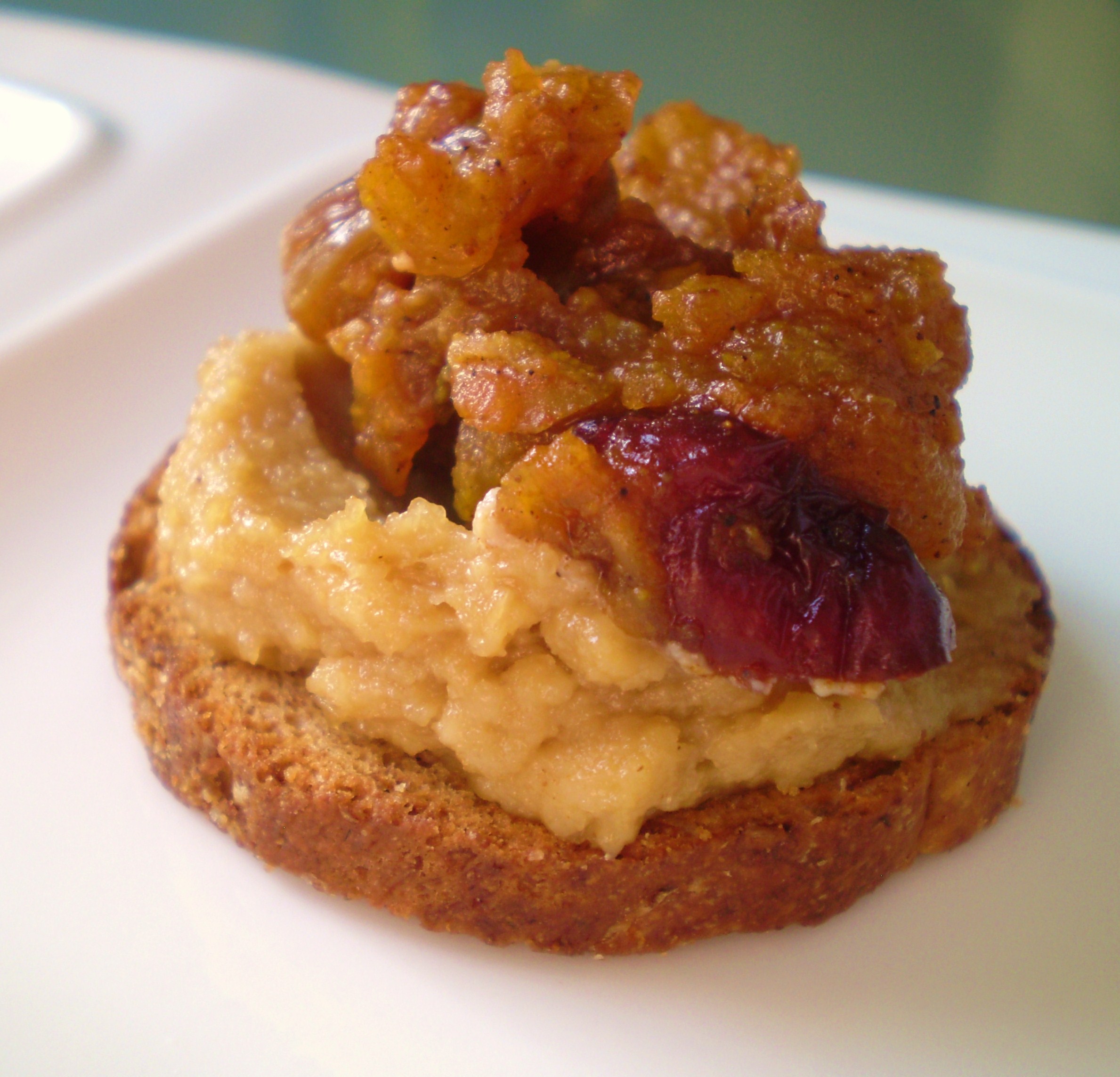 This recipe was inspired by a recipe for a side dish of roasted grapes in a current issue of a home and garden magazine. My recipe is slightly altered, including that it makes use of the lovely grape drippings in a silky pan sauce in which grilled tempeh is bathed before being served on a bed of bright green baby spinach under a tumble of the thyme-scented roasted grapes. The result is perfect to tuck into when you’re starved or to enjoy smaller portions, almost like tapas, when noshing is more the order of the day.