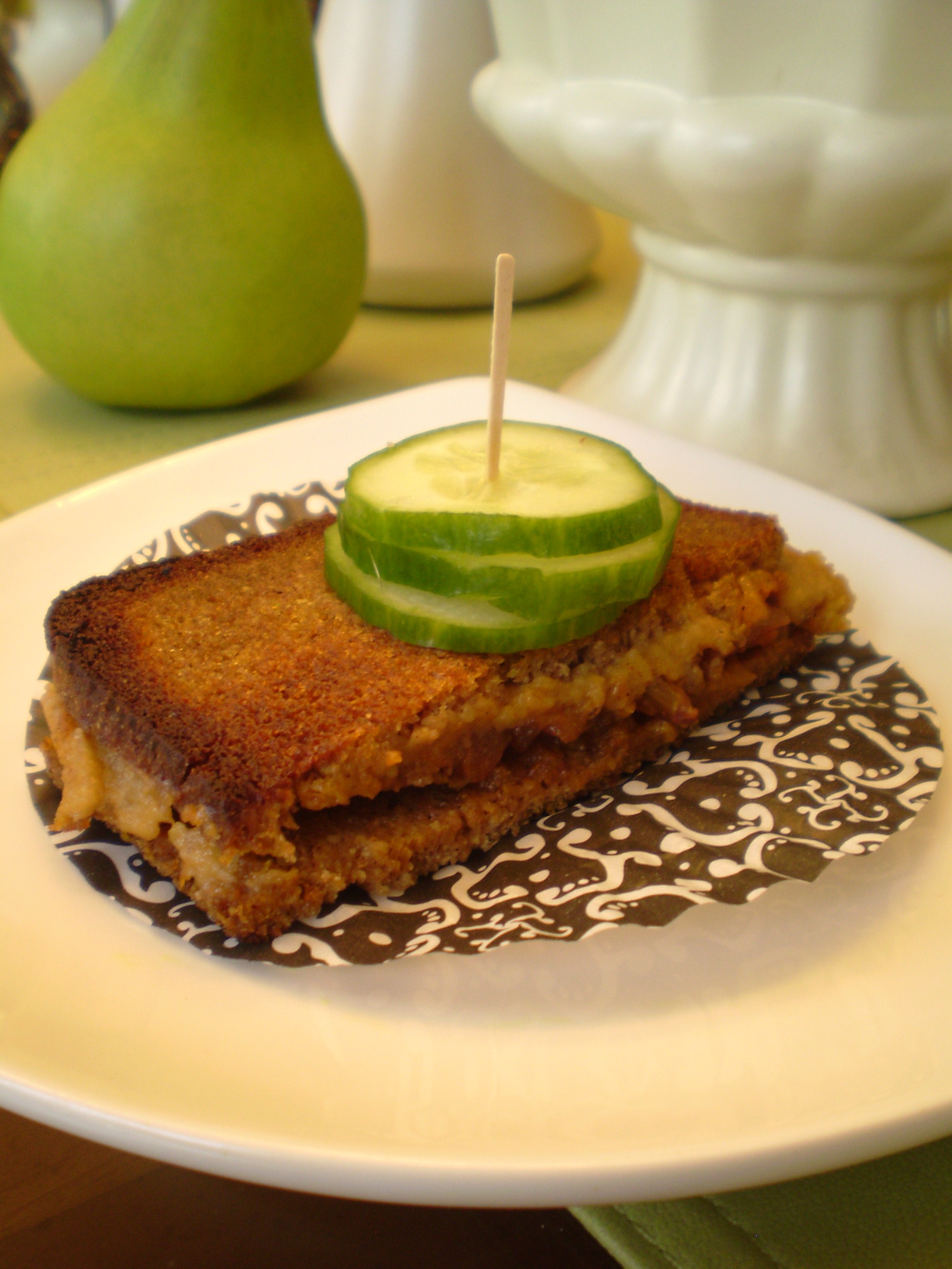 I love this combination of rich cashew cheese (featuring my secret “cheesy” ingredient!) and tangy sweet-and-savory chutney. The pairing is perfect perched on a cracker but, after the meeting and some errands, I was starved, so I came home and made a grilled cheese-and-chutney sandwich on super-thin Danish rye bread. Oh, my…