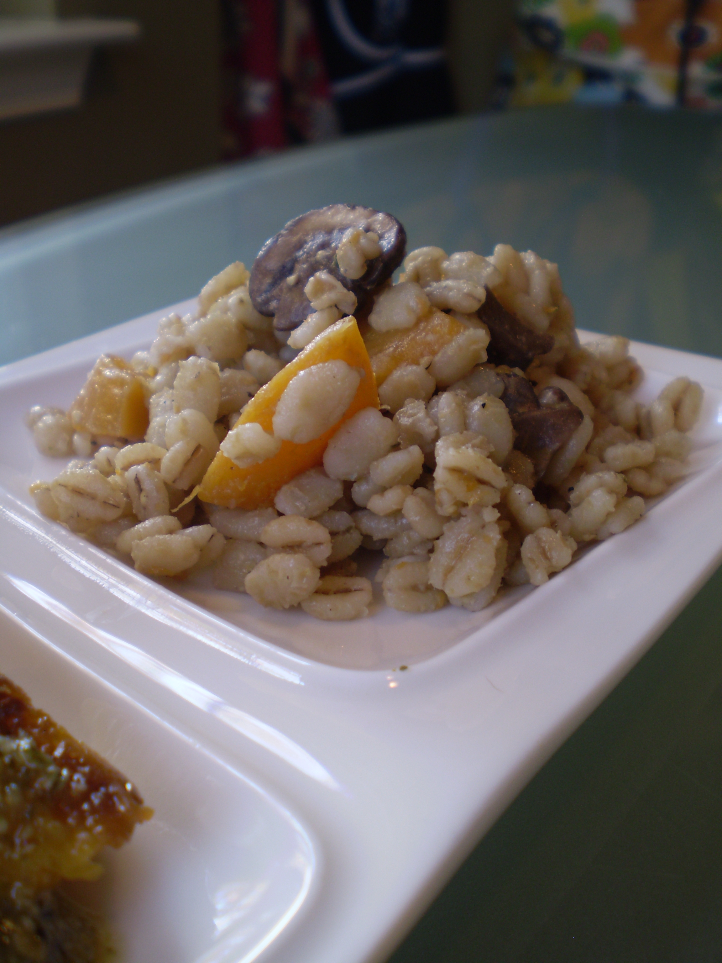 A barley, cous-cous and kasha salad featuring finely diced cucumber, red onion, basil, and lightly sauteed homegrown yellow squash-from one of my student’s garden;