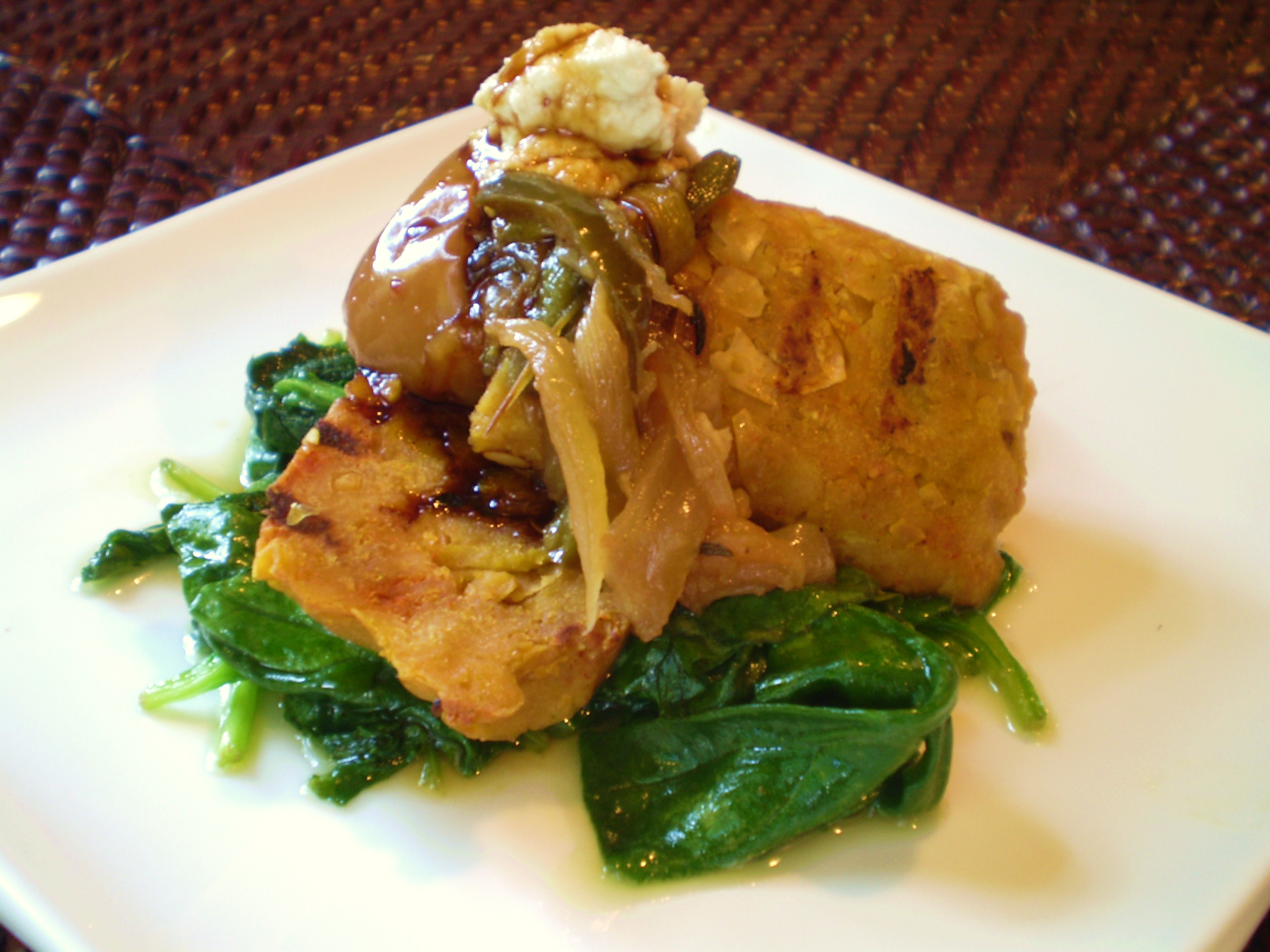Grilled Tempeh Over Sauteed Baby Spinach with White Wine Pan Sauce