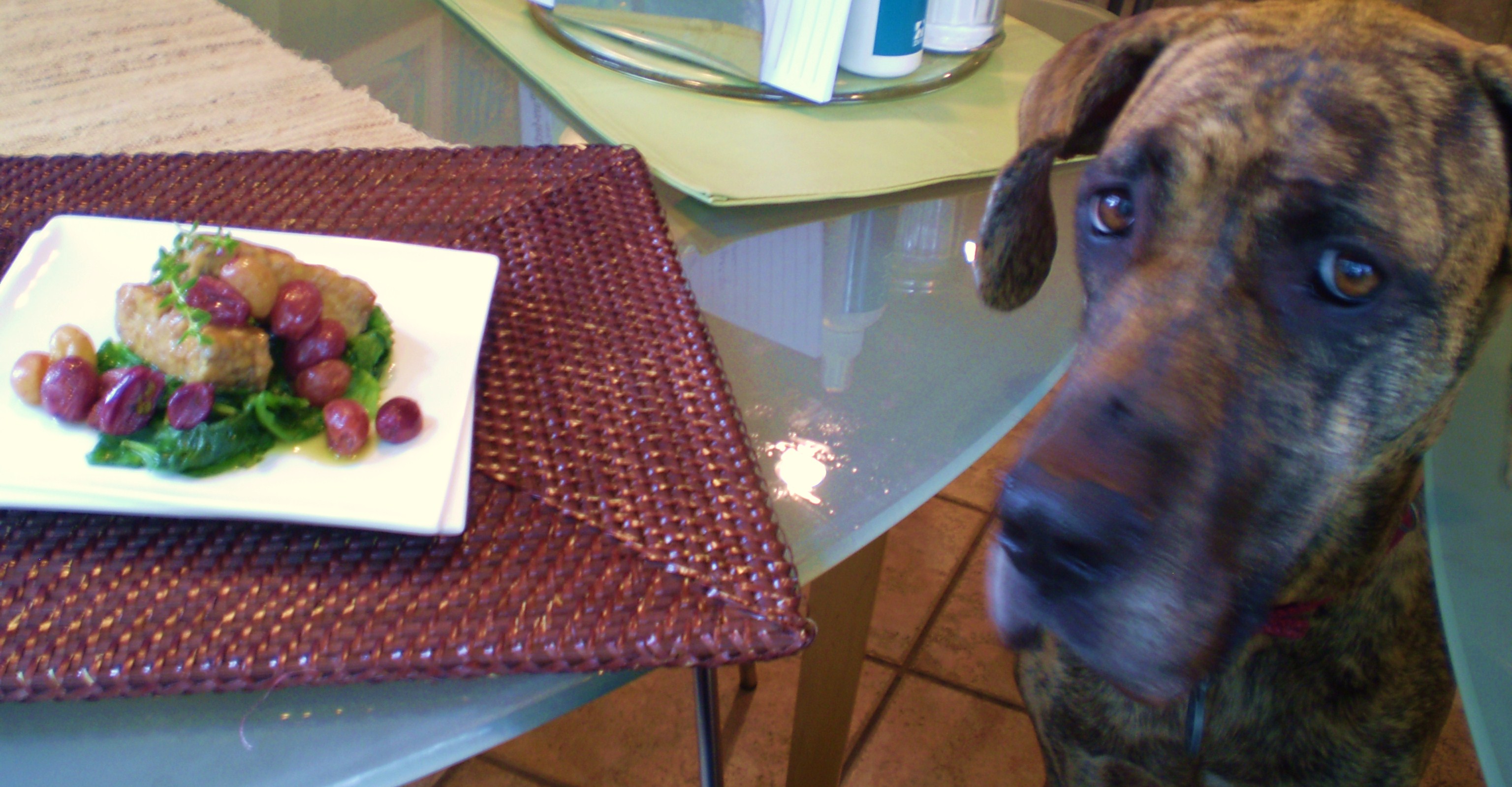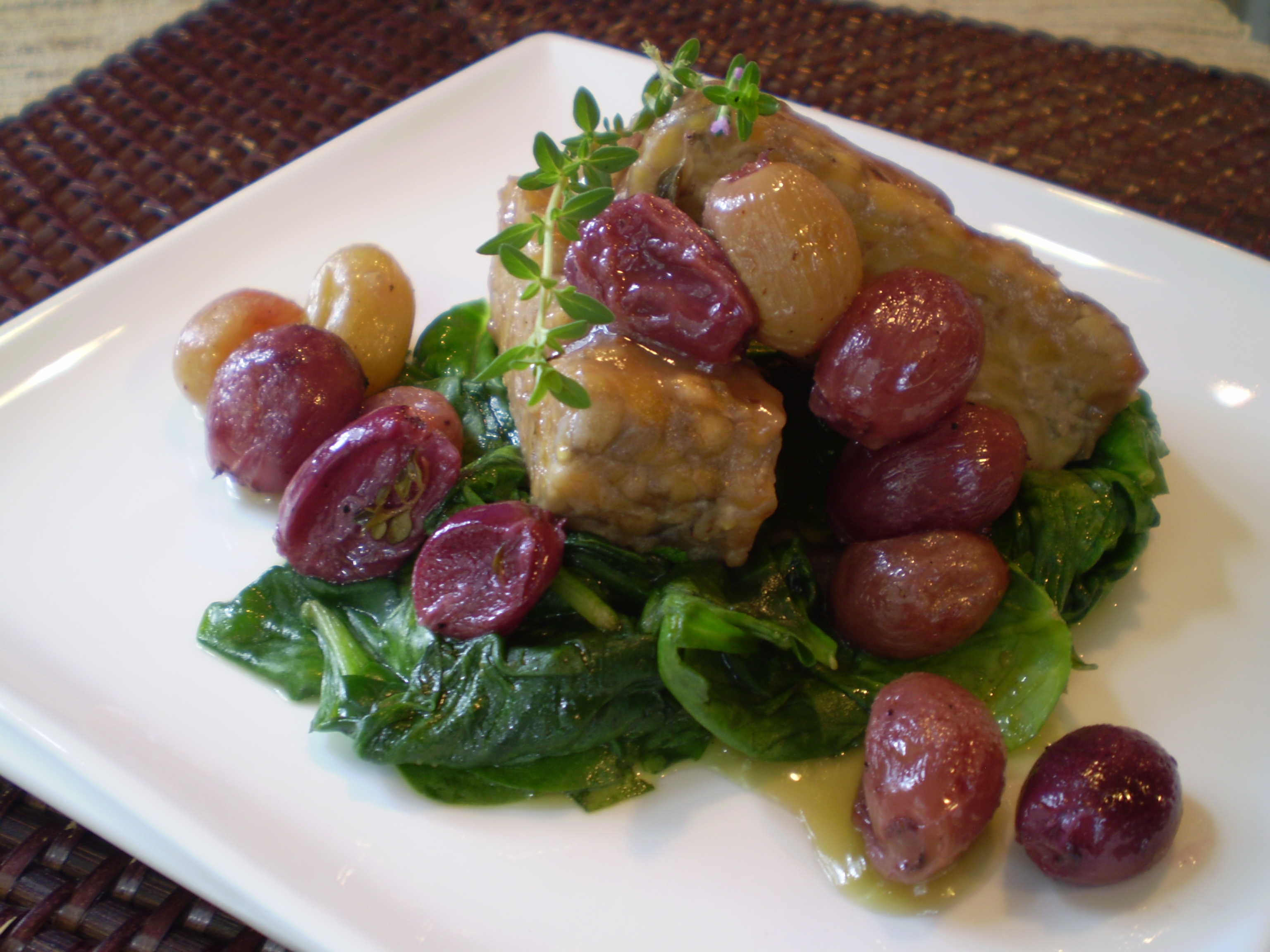 This recipe was inspired by a recipe for a side dish of roasted grapes in a current issue of a home and garden magazine. My recipe is slightly altered, including that it makes use of the lovely grape drippings in a silky pan sauce in which grilled tempeh is bathed before being served on a bed of bright green baby spinach under a tumble of the thyme-scented roasted grapes. The result is perfect to tuck into when you’re starved or to enjoy smaller portions, almost like tapas, when noshing is more the order of the day.