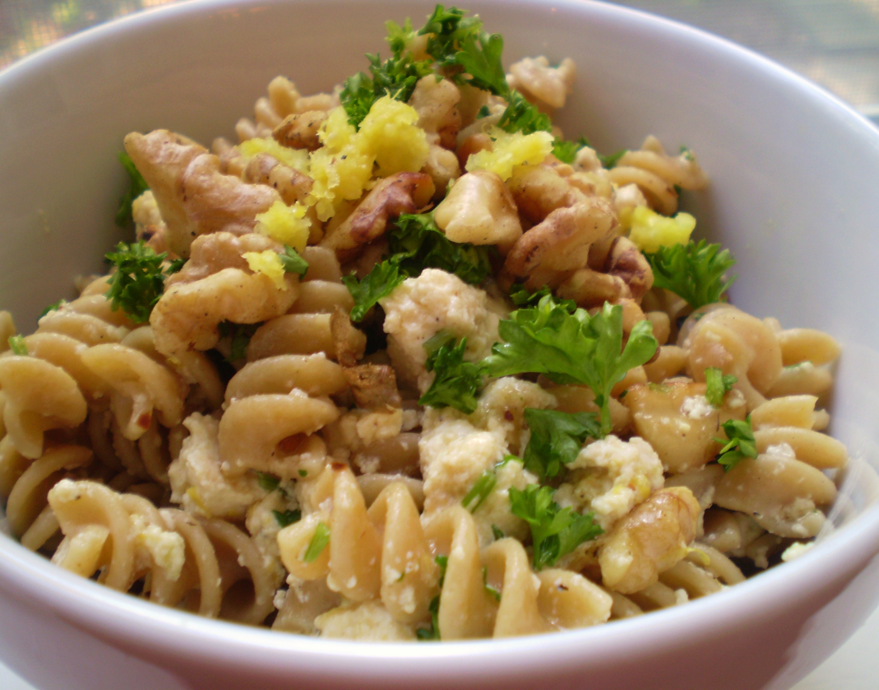 Heat a large pot of salted water to boiling over medium-high heat with the lid slightly ajar. Add the pasta, stir once, and simmer, reducing heat if necessary, for approximately 9 minutes or until al dente. Meanwhile, in a small saucepan, heat the olive oil and garlic over medium heat and very gently simmer for 2 to 3 minuts or until the garlic is softened and just barely begins to turn golden. Then, in a small bowl gently mash together with your fingers the tofu, nutritional yeast, sea salt and pepper to taste (it’s important to season every layer), adding the lemon zest toward the end. The tofu should be broken down into fluffy “chunks” about the size of peas. When the pasta is done, drain it well and return to the pot. Drizzle the olive oil over, sprinkle with parsely and gently combine. Add the mashed tofu, walnuts and a few red pepper flakes; gently combine. Check for seasoning, adjust as necessary, and serve warm garnished as desired.