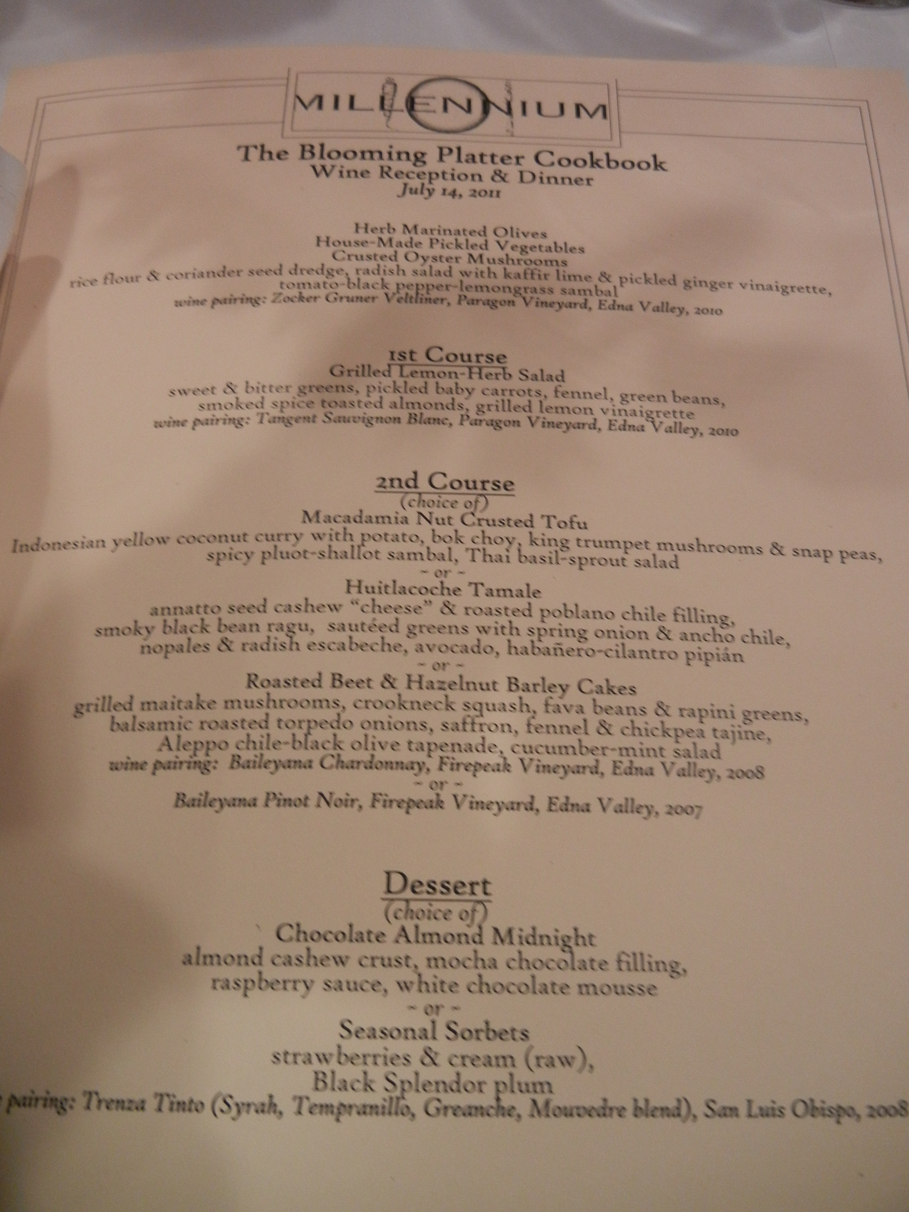 The Millennium is especially significant to me because it was the first vegan restaurant in which I ever dined many years ago, before I was even a vegan, and whose Millennium Cookbook, which I promptly bought, has been very influential to me on many levels.