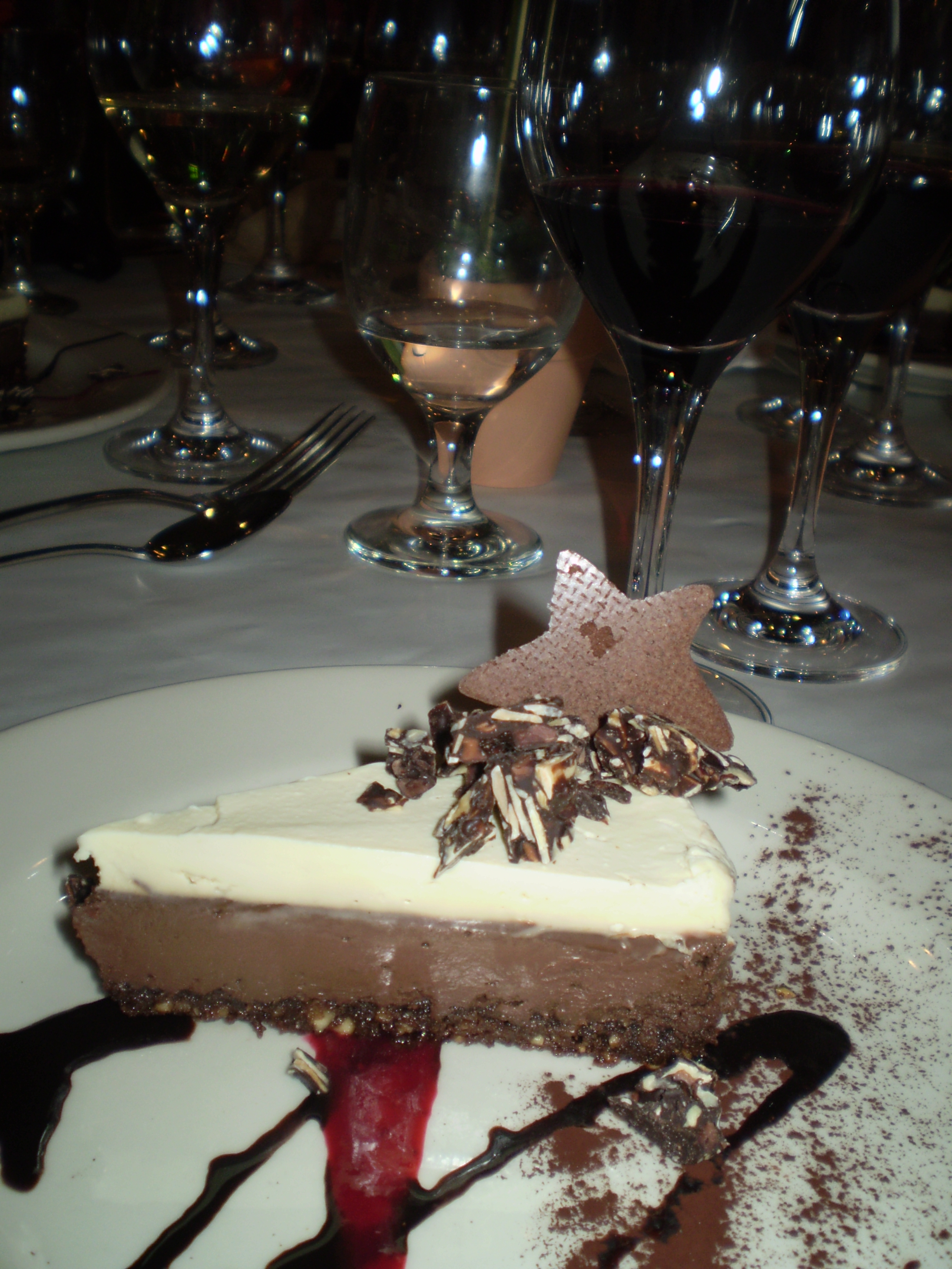 Now in a new location on Geary Street, but still connected to a hotel, the food and atmosphere are as appealing as ever. For a very affordable price of $50 per person, not including wine (more on this soon!), the chef offered three appetizers (including corn flour-dusted fried oyster mushrooms to die for–reminiscent of fried calamari–and everyone’s favorite); a delightfully fresh salad with a lemony dressing; 3 different entrees with beautiful sides and sauces (an Asian crusted tofu, a tamale, and a beet-and-barely cake); and either sorbet or my choice: Chocolate Almond Midnight, the restaurant’s signature dessert.