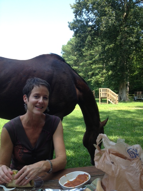 I’ve been wanting to meet him and have needed to test some recipes for a potential project, so Maggie and I decided to have a picnic lunch yesterday at the barn.  When she asked if I wanted to dine in the barn or at the picnic table, I chose the latter–it was a beautiful, mild summer day–asking if Rocky, grazing nearby, would be interested in our food.