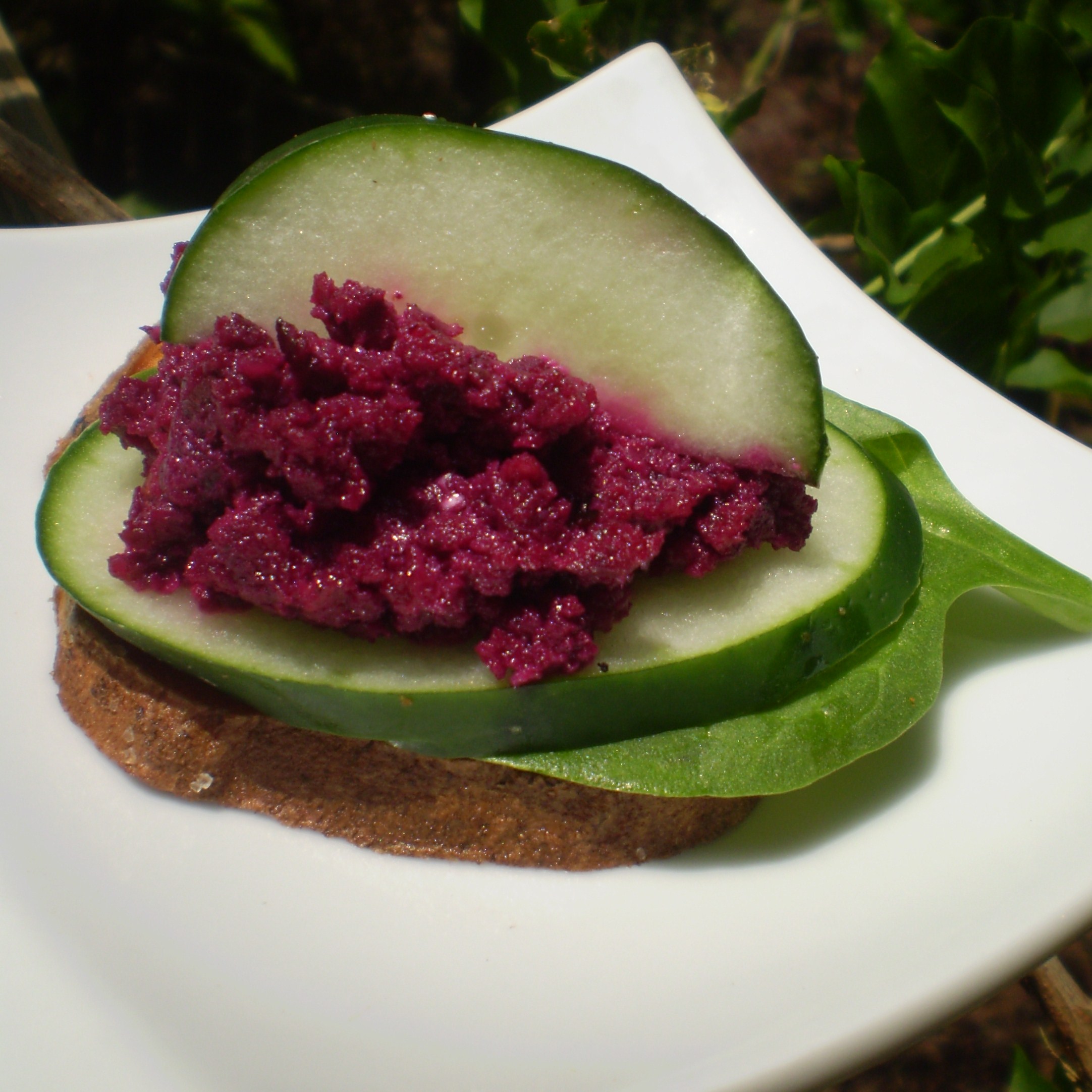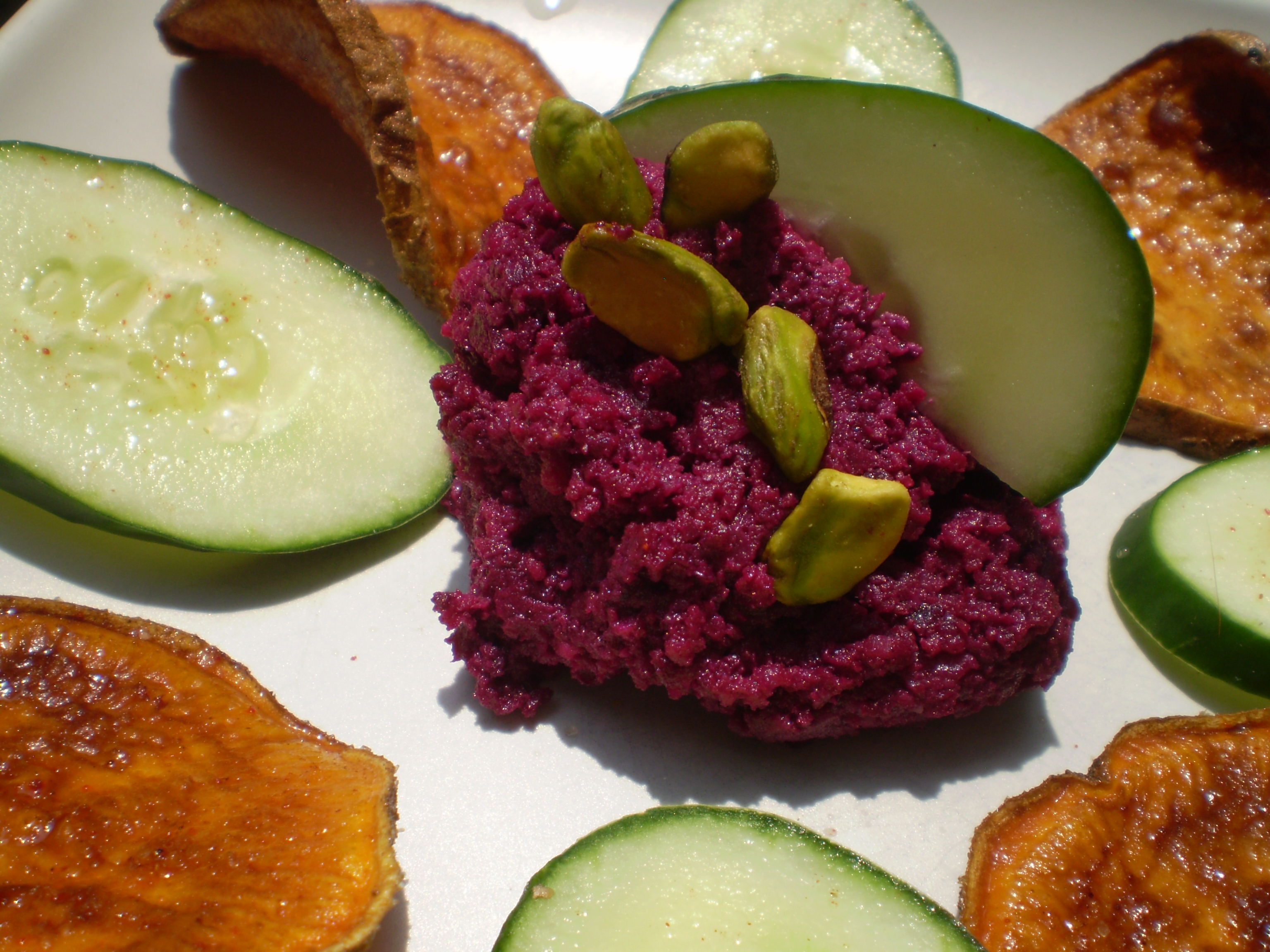 Anyway, that’s a long way of saying that I was glad that I had made fresh Beet Muhummara yesterday and created (and photographed) a beautiful plate of the beet spread and accompaniments earlier today so that it was ready as soon as I had showered. I served the spread with cucumber slices, spinach leaves, and some fresh fried sweet potato slices that I sprinkled with a mixture of 1 tablespoon sea salt, 1/4 teaspoon ground cumin, and 1/4 teaspoon smoked paprika. Oh, and some champagne. 🙂 Forgetting that walnuts were in the spread, I sprinkled a few pistachios on top. That’s okay, though, the green nut looked really pretty against the bright fuscia spread. And I think I’ll make some brownie bites with those leftover walnuts.