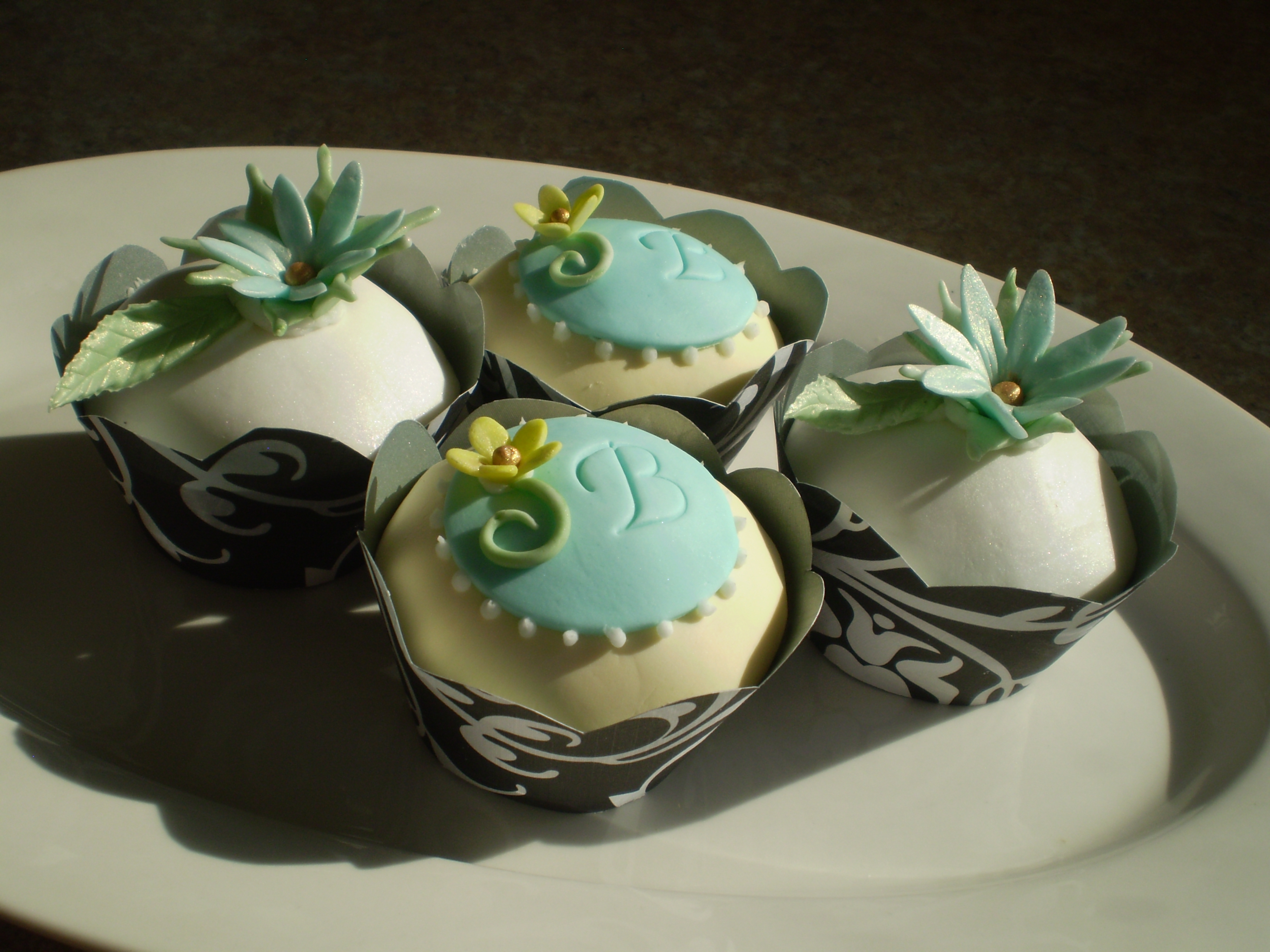 After an initial meeting, I emailed Chef de Long the Chocolate Carrot Cake recipe from The Blooming Platter Cookbook, and she used her own naturally vegan buttercream and sugar artistry to recreate two different cupcake designs I had researched, lending to them her own special touches. Then she wrapped them in scalloped cupcake wrappers I had made using a template I found online and scrapbook paper from a local arts and crafts store.