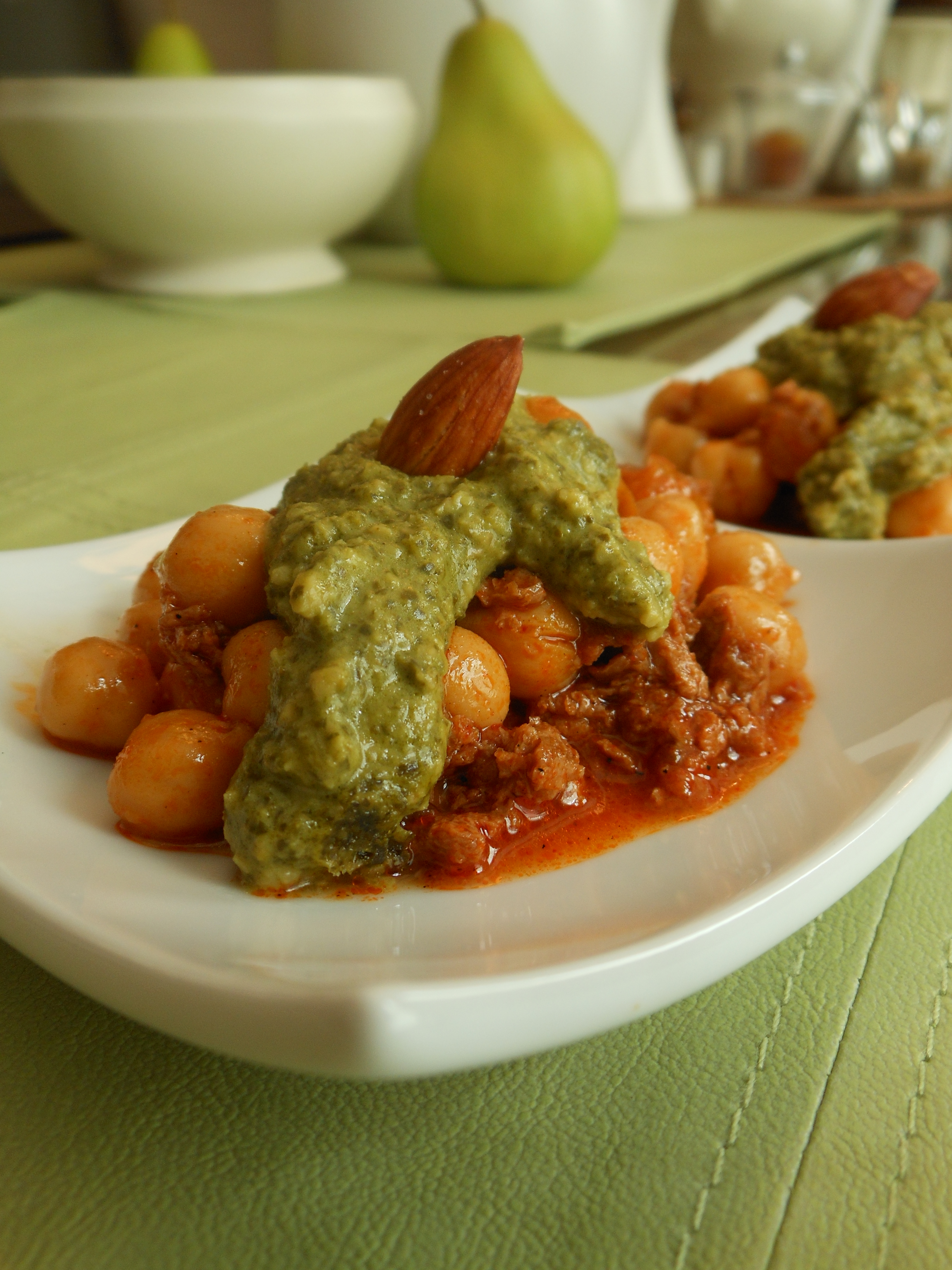 This Spanish-inspired dish is so pretty with its warm golden stew-like base and it’s fresh green sauce.  And the flavors complement each other perfectly: the spicy chorizo offset and cooled just a bit by the fresh kale sauce, made rich and creamy with buttery cashews.  The sweet-tart apples temper the heat of the chorizo, as well, creating a beautifully balanced fall dish that goes together in a snap.  I like to serve it as tapas, but no one would take issue with a big bowl of it!