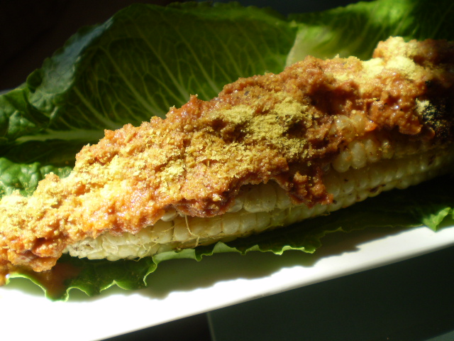 Roast for 20-25 minutes, turning after about 10 minutes, until desired color is achieved; just avoid drying it out. Remove the corn from the oven and, when cool enough to handle, spread each cob with approximately 2 tablespoons of Romesco Sauce and sprinkle with a couple of teaspoons of nutritional yeast. Serve on a lettuce-lined plate if desired. And for a special touch, tie a strip of the reserved husk in a knot or bow around the “stem” end of the cob.
