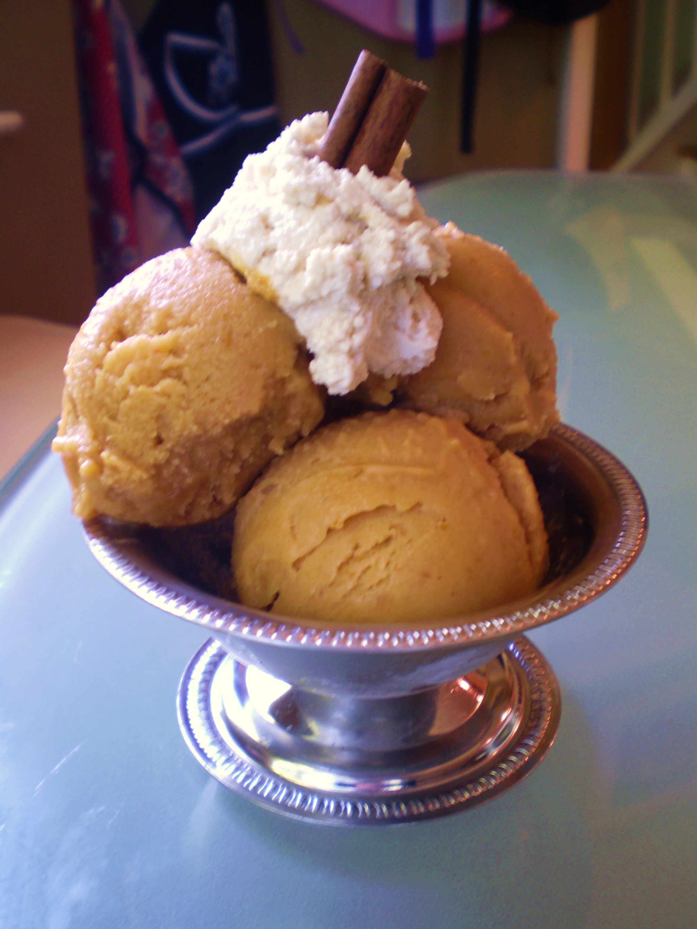 I love pumpkin as much as I do sweet potatoes, which is to say ” a whole lot!” so I was all in. And I love it in both savory and sweet dishes. This one is a not-too-sweet, but plenty sweet enough (that one’s for you, Lee!), maple-infused pumpkin ice cream. I serve mine with sweetened Cashew Cream and a cinnamon stick. But it would be delicious, say, with my Pepita Caramel Syrup (which is equally good on my Vegan Pumpkin-Bourbon French Toast) or with Pepita Brittle.
